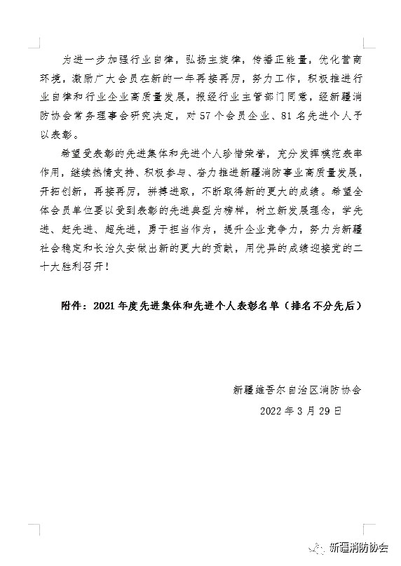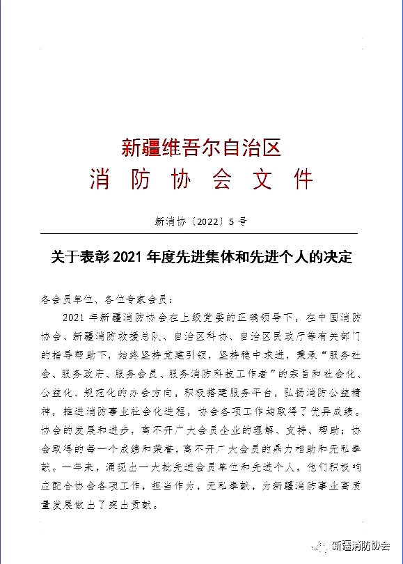 發(fā)布日期:2022-04-02 11:52:00為了進(jìn)一步加強(qiáng)行業(yè)管理,規(guī)范從業(yè)行為,表彰先進(jìn),鼓舞士氣,積極營(yíng)造依法執(zhí)業(yè)、優(yōu)質(zhì)高效的消防行業(yè)市場(chǎng)環(huán)境,今年年初,新疆自治區(qū)消防協(xié)會(huì)在全區(qū)會(huì)員企業(yè)中開展了2021年度消防先進(jìn)單位和先進(jìn)個(gè)人的評(píng)選活動(dòng)。經(jīng)企業(yè)自行申報(bào),協(xié)會(huì)秘書處按照評(píng)選條件和辦法初審、常務(wù)理事會(huì)集體評(píng)選、新疆消防協(xié)會(huì)公示后,2022年3月29日協(xié)會(huì)正式發(fā)文《關(guān)于表彰2021年度先進(jìn)集體和先進(jìn)個(gè)人的決定》,我公司天山區(qū)維保組長(zhǎng)丁文霆榮獲2021年度消防技術(shù)服務(wù)“先進(jìn)個(gè)人”表彰。